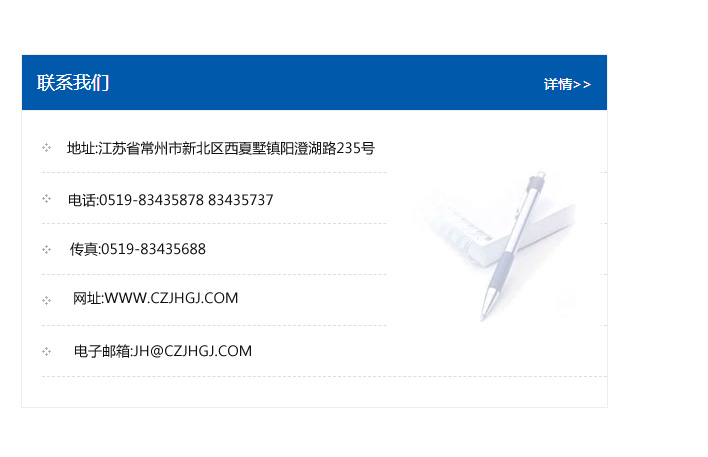 地址:常州市新北區友邦商務大廈1幢16、17層  電話:0519-85101652  傳真:0519-85112595  郵編:213022  網址:www.cz-jiayue_cn.appcw.com  郵箱:xiajifengaa@163.com